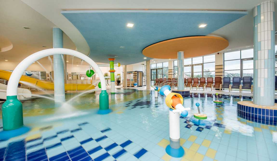 Конечно, лечебные бассейны, где температура воды +38-43°С, ребенку ни к чему. Его ждут другие радости: игровые бассейны с яркими горками и фонтанчиками под открытым небом, водная карусель и горка для крох в помещении, волновой бассейн для всей семьи, мягкая широкая горка для того, чтобы дети могли съезжать по ней вместе с родителями.