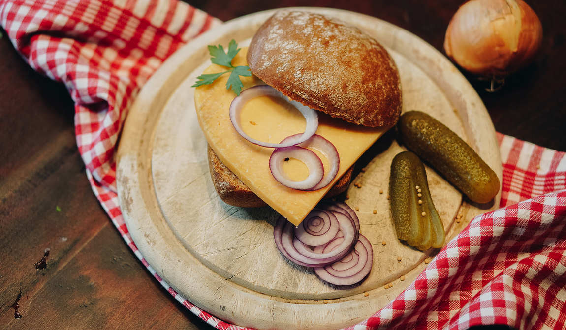 Another quick snack popular in Düsseldorf and Cologne is the Halve Hahn sandwich. The recipe is simple: a rye bun, gouda cheese, mustard and pickle. Sometimes the bun is topped with onions and a sprinkling of paprika.