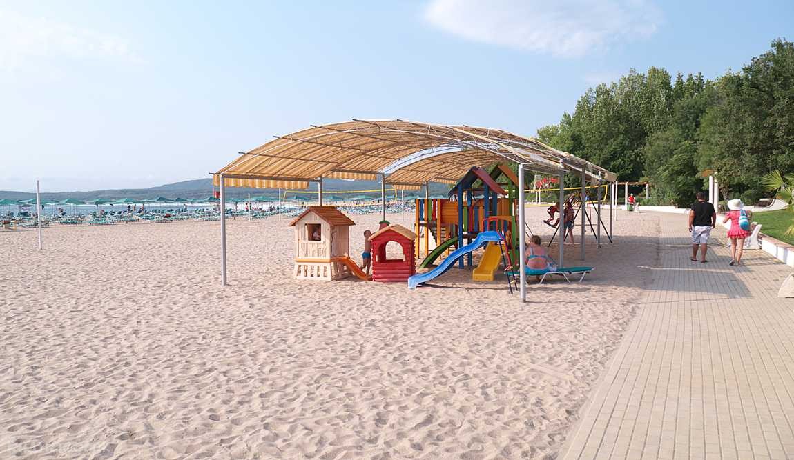 Специальных пляжей для детей на курорте нет, поскольку в них нет необходимости. Во-первых, в любом месте побережья безопасно загорать и удобно купаться. Во-вторых, на пляже есть детские площадки. Над ними устроен навес, так что можно не опасаться прямых солнечных лучей.